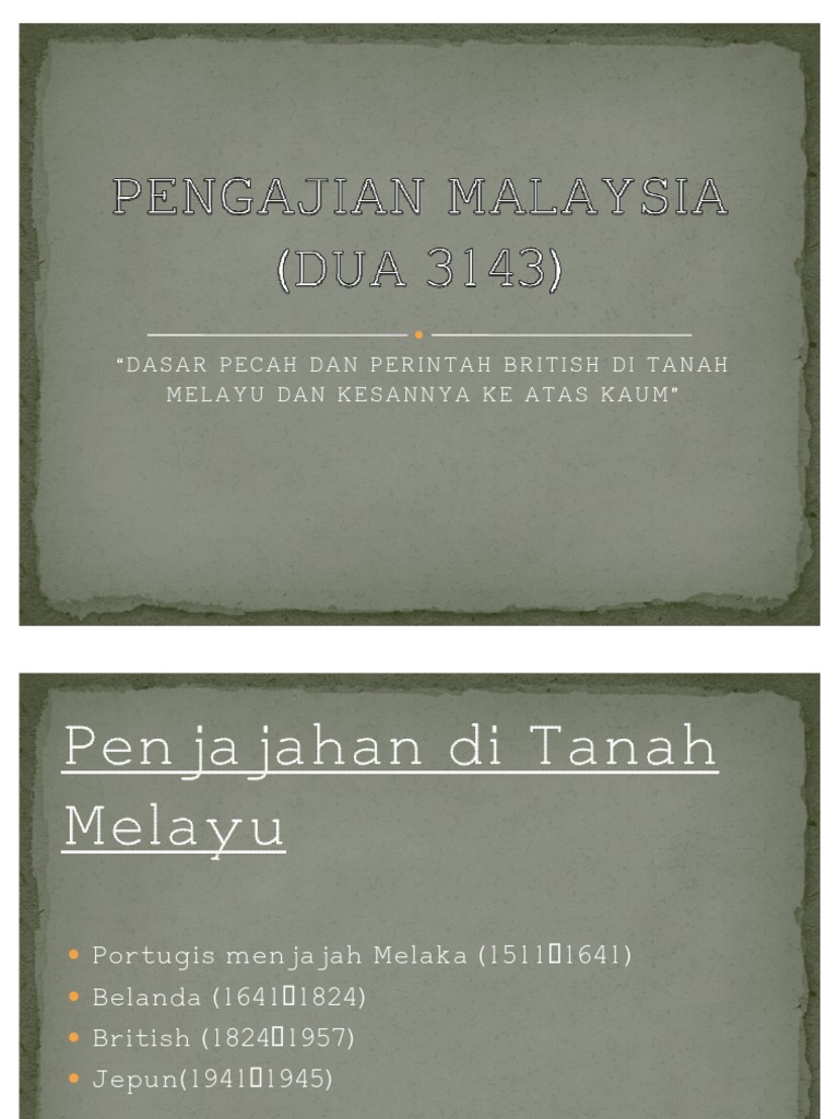 Maksud Dasar Pecah Dan Perintah 2 Dasar Pecah Dan Perintah British Di Tanah Melayu Pptx Ciri Yang Jelas Dalam Pepatah Dapat Dilihat Pada Pengulangan Kata Yang from slidetodoc.com Pertelingkahan kaum yang berlaku telah mengakibatkan negara kehilangan banyak nyawa dan kerugian harta benda. Dasar ini diburukkan lagi oleh kuasa barat yang menjalankan dasar pecah dan perintah yang menghalang wujudnya perpaduan kaum. Kemuncak kepada kesan dasar pecah dan perintah inggeris di tanah melayu tanggal 13 mei 1969 tercetus satu detik hitam dalam lipatan sejarah negara. Orang british adalah pakar dalam pecah dan perintah. Dasar pecah dan perintah yang diperkenalkan oleh british juga melebarkan lagi jurang perpaduan antara masyarakat dan akhirnya membawa kepada british sengaja membiarkan keadaan ini supaya mereka senang memerintah dan mengaut kekayaan di tanah melayu dengan sewenangwenangnya. Dasar pecah dan perintah yang dijalankan oleh pihak british telah memberikan kesan daripada pelbagai aspek: Niscaya melayu akan makin besar dan menjadi bangsa terpandang di dunia. Kerajaan manchu mula memberi bantuan kewangan kepada pendidikan orang cina di tanah melayu untuk menyebarkan ideologi kepada.